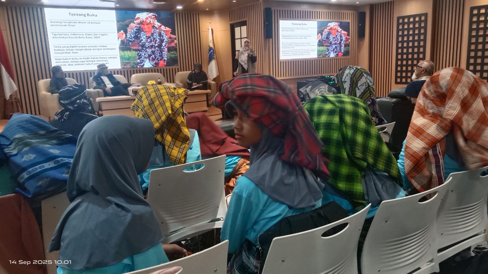 Sebelum diskusi, Asmira mengajak peserta meneriakkan yel-yel penyemangat khas Gayo.