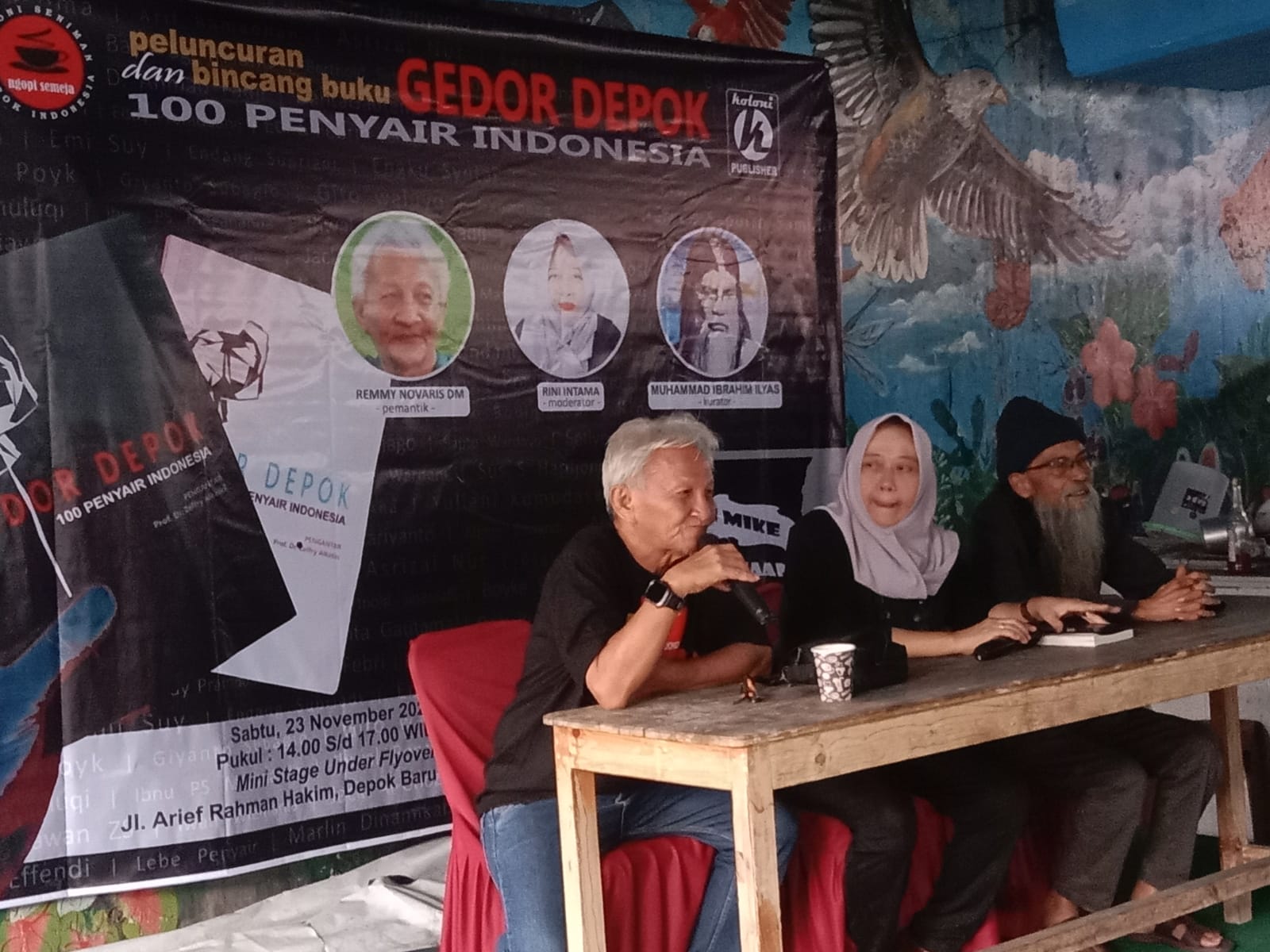 “Depok memiliki sejarah panjang seperti halnya kota-kota tua di dunia. Oleh karenanya layak dirayakan melalui karya puitik tanpa terjebak pada sentimen tertentu,” ujar Muhammad Ibrahim Ilyas saat menjadi pembicara dalam acara launching buku Gedor Depok di Koloni Ngopi Semeja di mini stage kolong flyover Jalan Arif Rahman Hakim, Depok, Sabtu (23/11/24).
