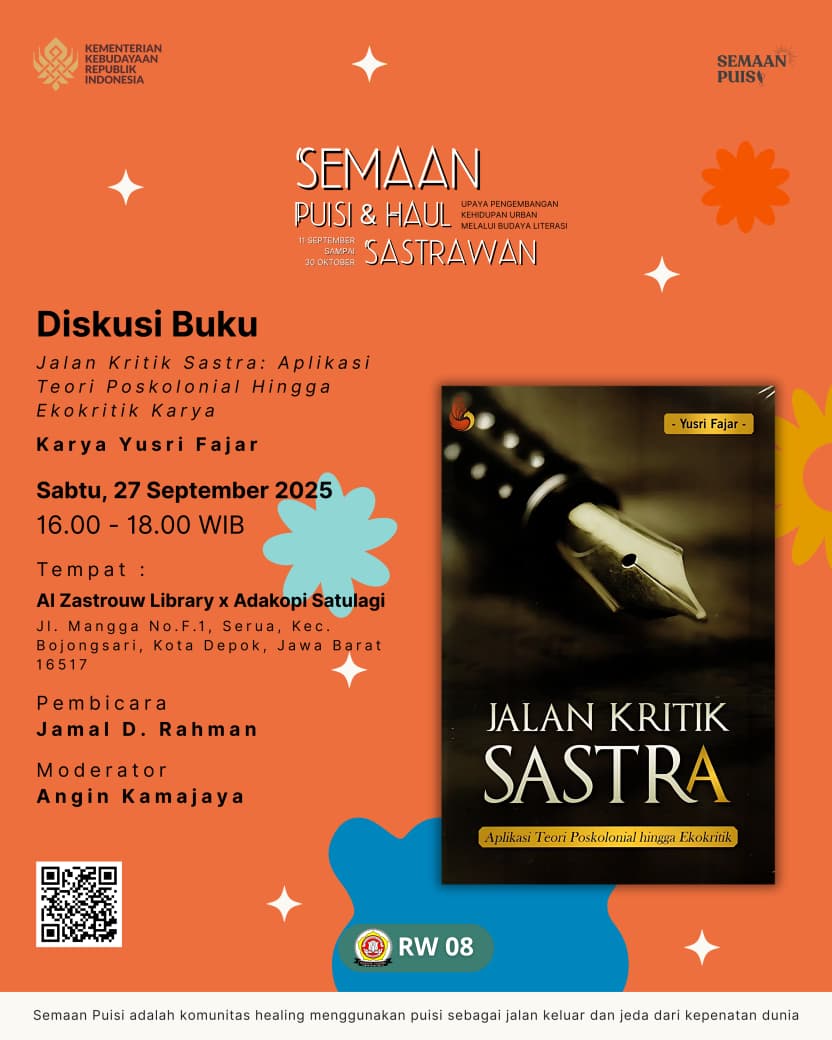 Diskusi buku “Jalan Kritik Sastra: Aplikasi Teori Poskolonial hingga Ekokritik” akan berlangsung pukul 15.30 hingga 18.00 WIB di Al-Zastrouw Library x adakopi.