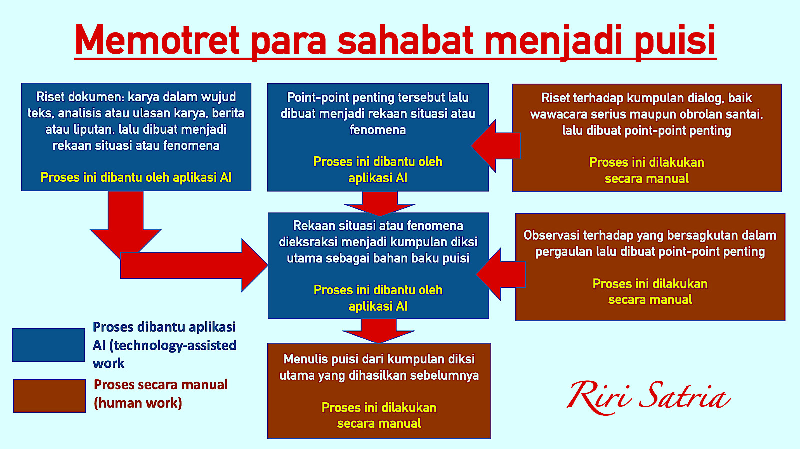 Bagan yang ditampilkan di tulisa ini menjelaskan sebuah metode kreatif yang saya sebut sebagai memotret sahabat menjadi puisi, sebuah pendekatan interpretatif dan engineering berbasis AI dalam proses kreatif. Kata memotret dalam konteks merupaka upaya menangkap potret kehidupan seseorang melalui pengalaman, percakapan, dokumen, dan pengamatan, kemudian mengolahnya menjadi puisi yang reflektif dan personal.