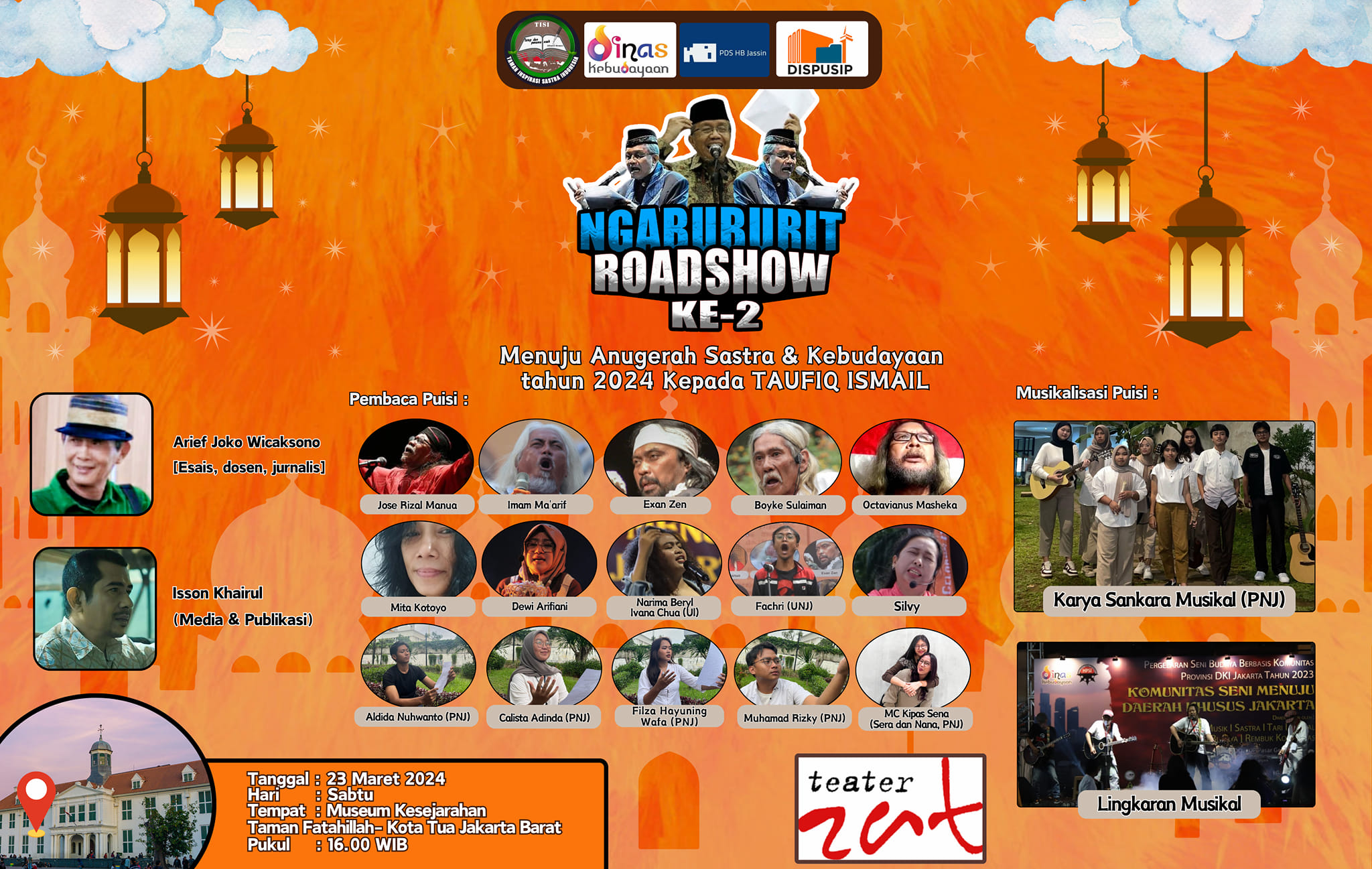 PojokTIM – Kegiatan baca puisi tidak mati di bulan Ramadhan. Tidak tanggung-tanggung, Komunitas Taman Inspirasi Sastra Indonesia (TISI) menggelar road show pembacaan puisi kolaborasi dalam semangat regenerasi dengan tajuk “Ngabuburit Road Show, Menuju Anugerah Sastra & Budaya untuk Taufiq Ismail”.