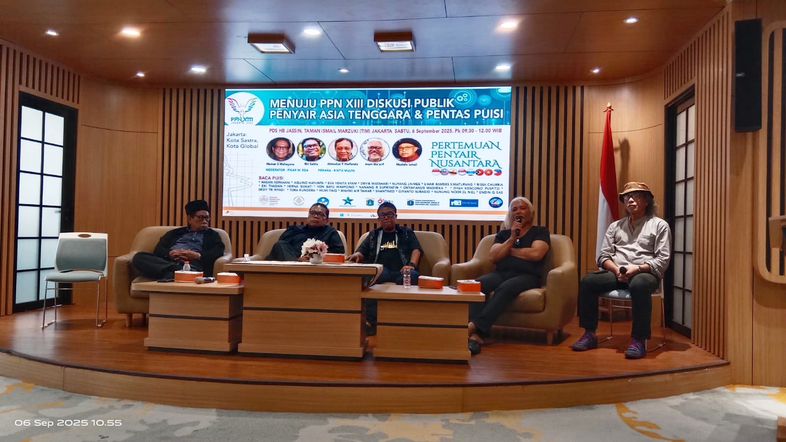 Mustafa didampingi Ketua Dewan Pengarah Imam Ma’arif, Wakil Ketua Dewan Pengarah Riri Satria, Ketua Dewan Kurator antologi puisi PPN XIII Maman S Mahayana, serta Fikar W Eda selaku moderator.