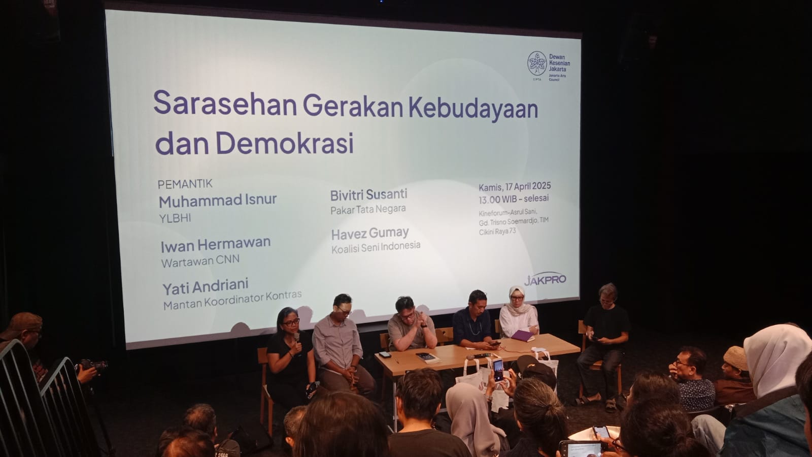 PojokTIM – Berbagai elemen pro demokrasi seperti YLBHI, KontraS, Koalisi Seni Indonesia hingga Efek Rumah Kaca. grup musik yang lantang menyuarakan masalah-masalah sosial, berkumpul di Bioskop Kineforum yang juga ruang Teater Asrul Sani, kompleks Pusat Kesenian Jakarta Taman Ismail Marzuki, Cikini Jakarta Pusat, Kamis (17/4/2025).