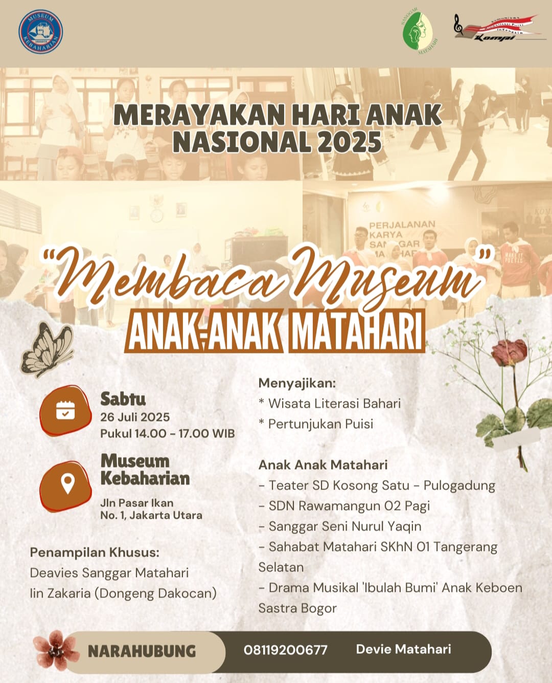 “Dalam rangka memperingati Hari Anak Nasional (HAN) 2025, Sanggar Matahari bersama Museum Kebaharian Jakarta menggelar acara bertajuk Membaca Museum: Anak-Anak Matahari. Kegiatan ini mengusung semangat literasi dan ekspresi seni anak, serta mengajak peserta menyelami sejarah bahari Indonesia melalui pendekatan kreatif dan partisipatif,” ujar Ketua Panitia Membaca Museum, Devie Matahari melalui siaran pers yanag diterima PojokTIM, Jumat (25/7/2025).