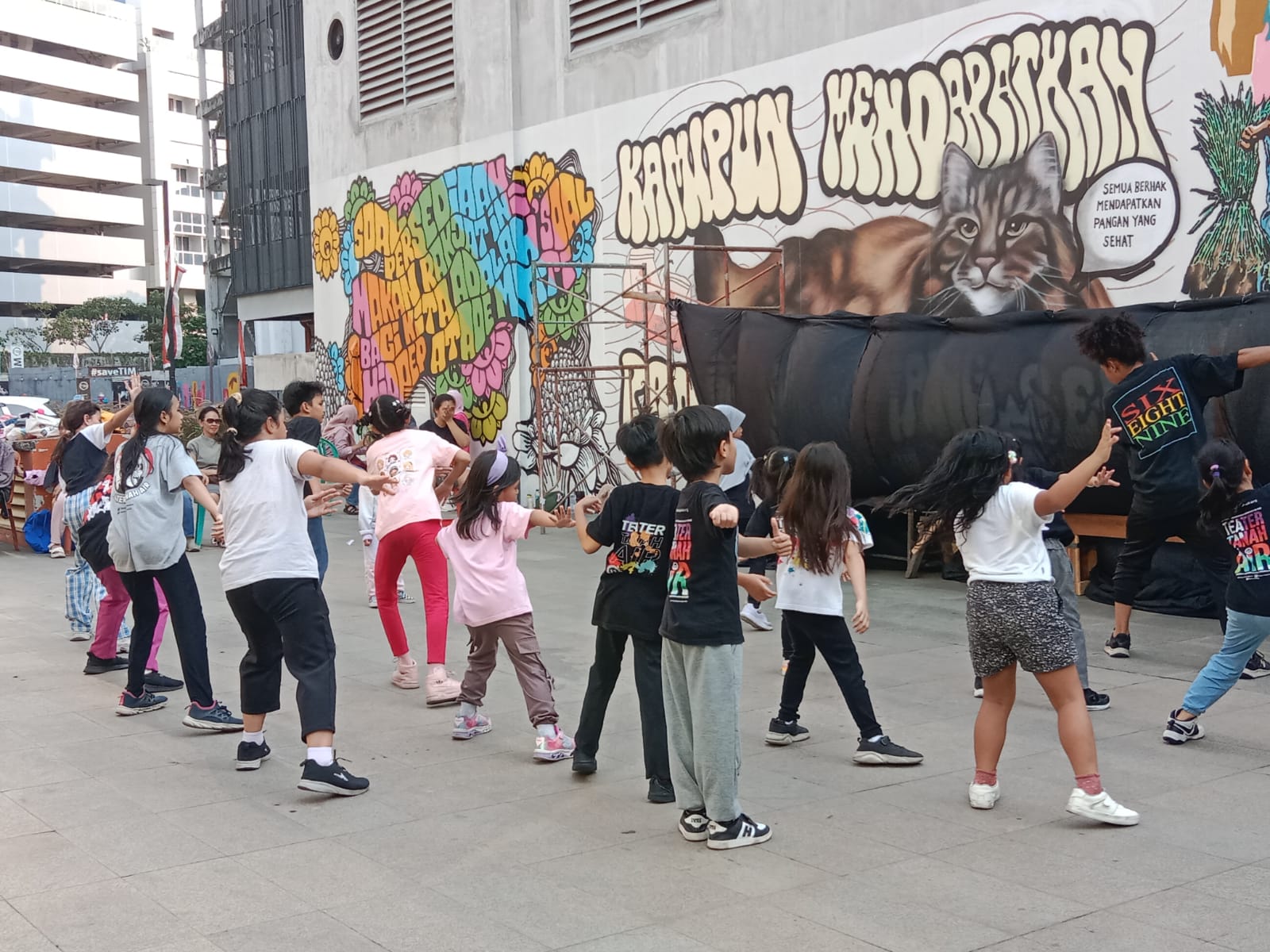PojokTIM – Ceria dan gembira. Itu kesan pertama ketika melihat anak-anak usia 4-12 tahun itu seperti tengah bermain; bernyanyi, berlarian ke sana-sini, tertawa dan bergurau bersama teman-temannya di bawah sinar matahari sore yang dipantulkan dari gedung apartemen di sekitar kompleks Pusat Kesenian Jakarta Taman ismail Marzuki (PKJ TIM), Minggu (1/9/2024).