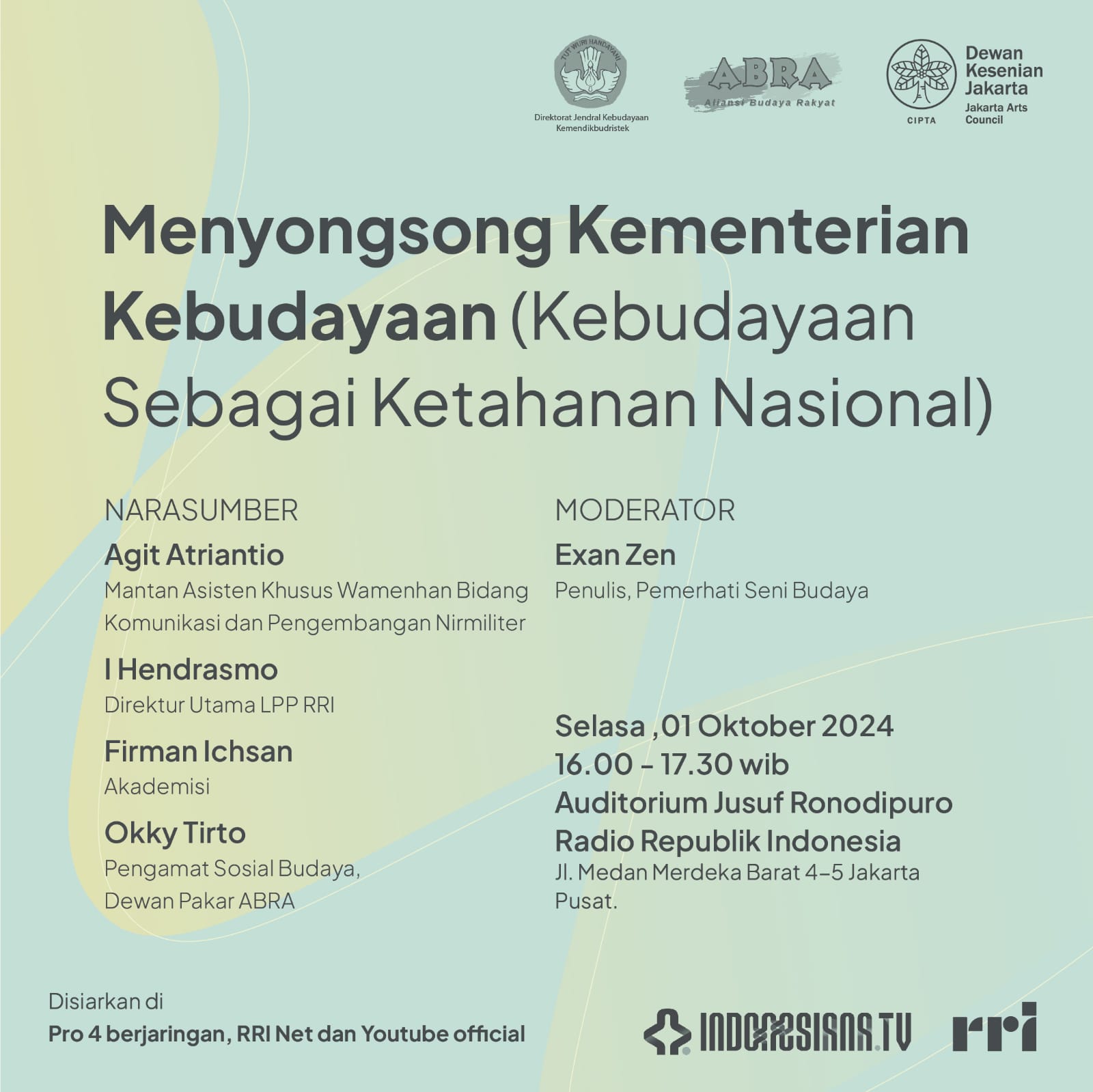 ABRA pun semakin optimis mendorong terbentuknya Kementerian Kebudayaan Republik Indonesia pada pemerintahan periode 2024-2029. Untuk itu, ABRA bekerjasama dengan Dewan Kesenian Jakarta, Ditjen Kebudayaan Kemendikbudristek dan Radio Republik Indonesia ABRA akan menggelar diskusi seri ke-4 dengan tema “Menyongsong Kementerian Kebudayaan” pada Selasa, 1 Oktober 2024 pukul: 16.00 – 17.30 WIB di Auditorium Jusuf Ronodipuro RRI, Jalan Medan Merdeka Barat 4-5 Jakarta Pusat.